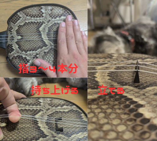 - 左手で弦を軽く持ち上げ、右手でウマを差し込みながら立てる。