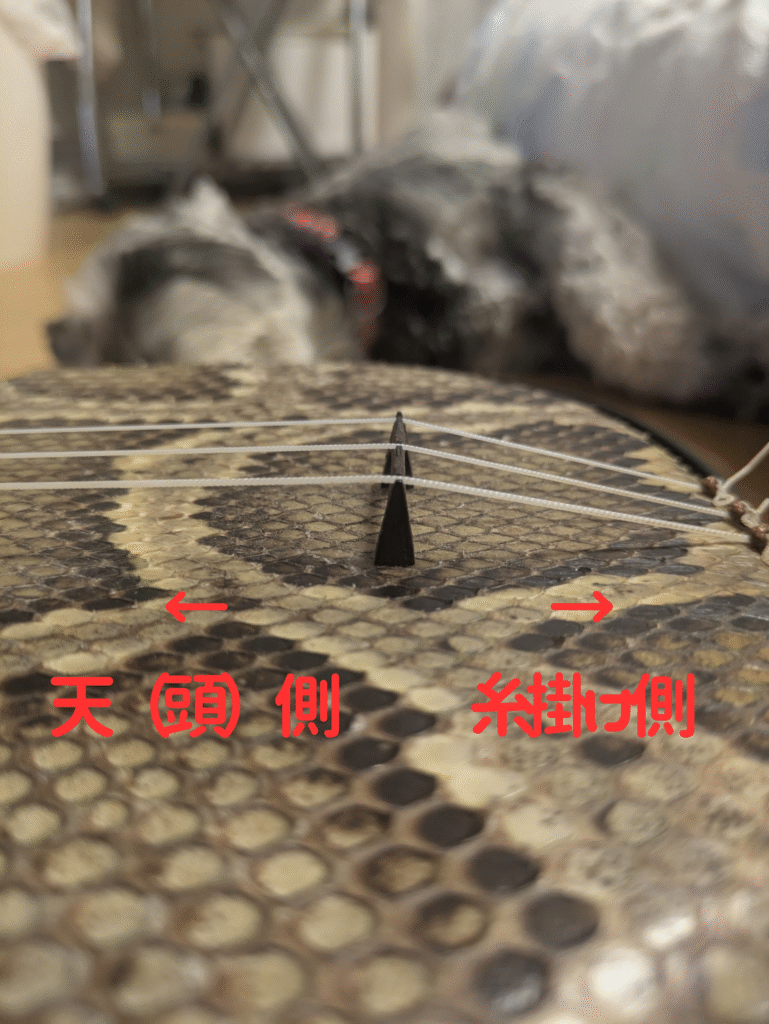- 糸掛け(弦の末端)から指3〜4本分ほどの位置に立てる。