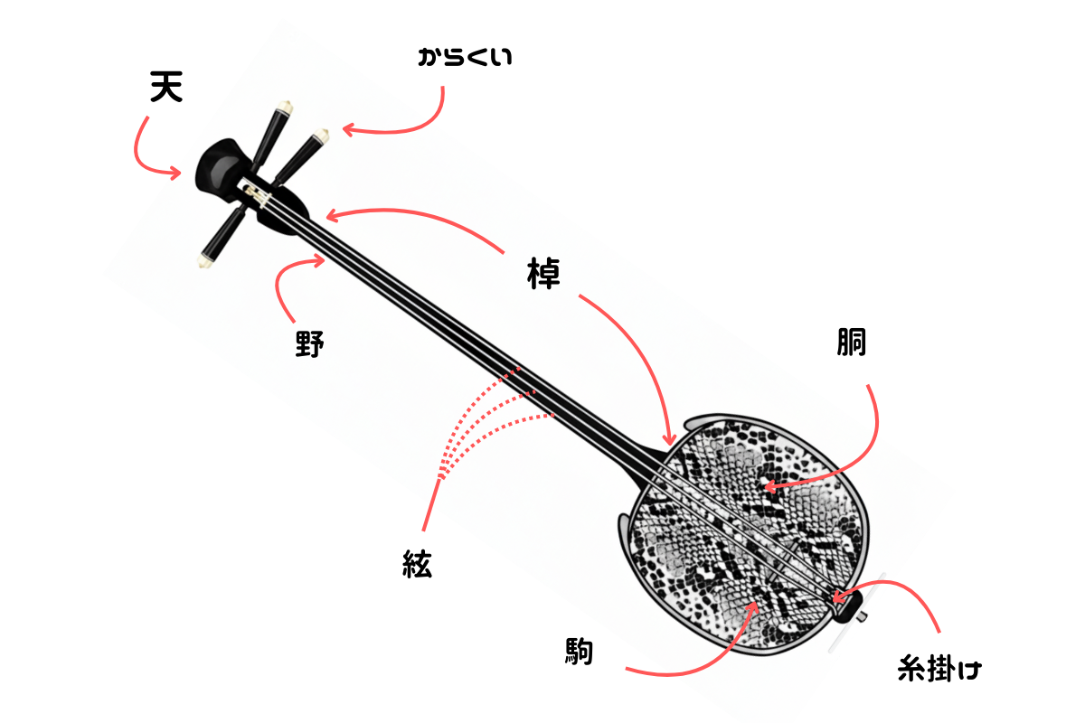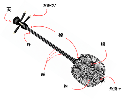 天・からくり・絃・棹・野・胴・駒・糸掛け