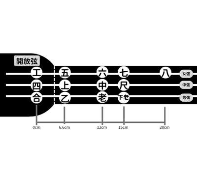 女弦:工(こう) → 五(ご) → 六 (ろく)→ 七 (なな)→ 八(はち)